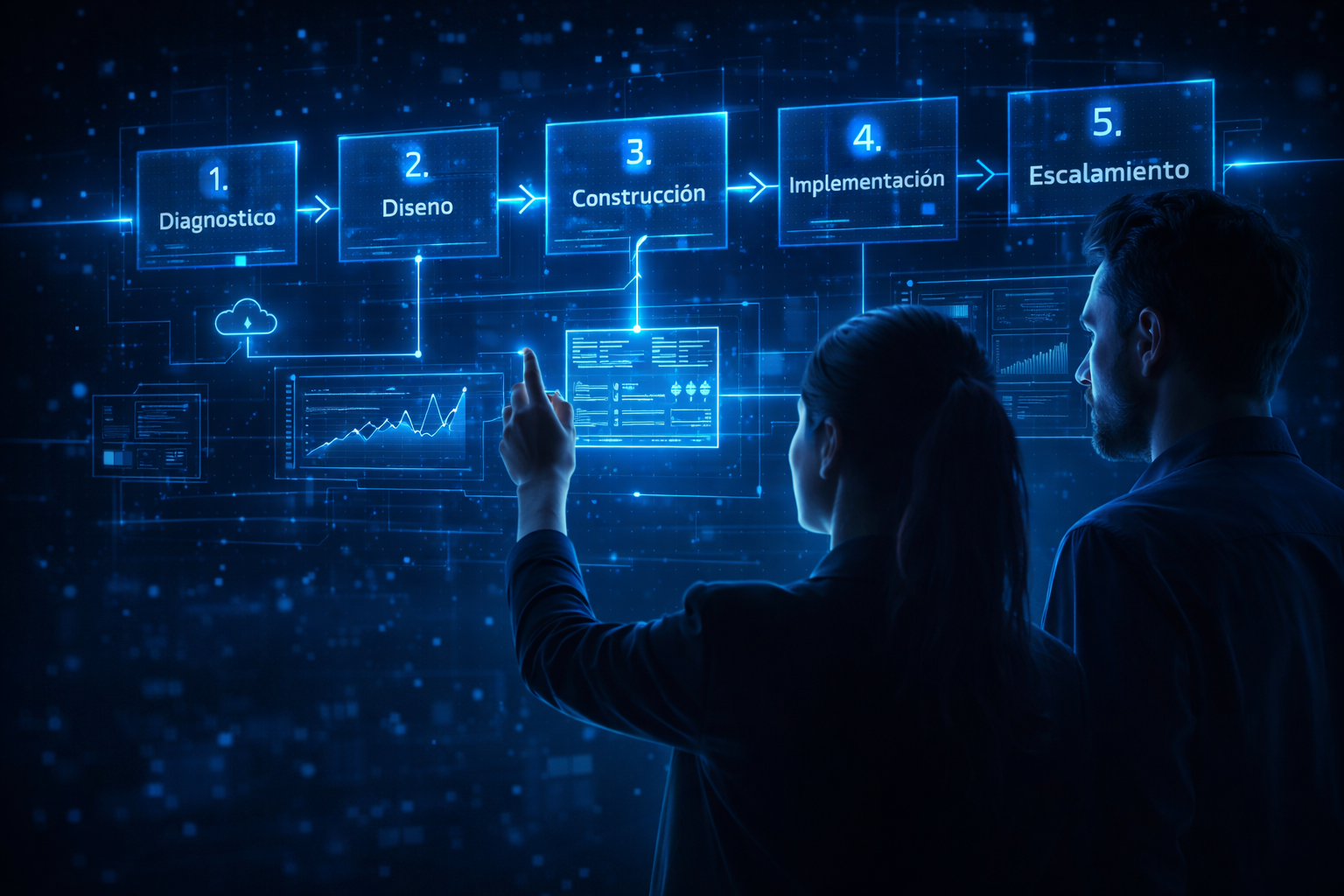Operamos los proyectos por etapas claras, con objetivos definidos y entregables concretos en cada fase. Iniciamos entendiendo el problema y el contexto del negocio, para después diseñar la solución tecnológica adecuada y construirla de forma progresiva, priorizando primero lo que genera mayor valor para la operación.